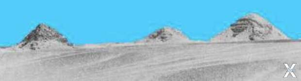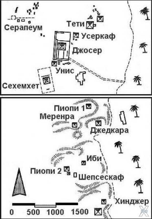 Еще большими размерами могут похвастаться пирамиды в районе Саккары (верхний рисунок - Саккара-север, нижний - Саккара-юг) (сверху-вниз): Пирамида Джосера (125 м х 115 м, высота - 61 м); пирамида Сехемхета - квадрат 120 м на 70 м высоты. Средние размеры пирамид Саккара-юг несколько меньше - порядка 70 - 80 метров в основании. (В пирамиде Пиопи 1 найдены "Тексты пирамид")