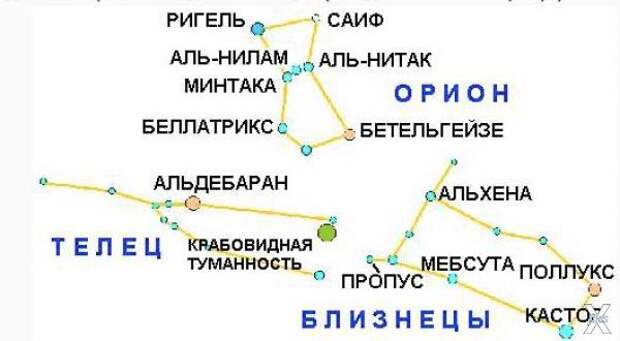 И если три пирамиды Гизы соотнести с тремя звездами пояса Ориона (Аль-Нитак, Аль-Нилам и Минтака), то для двух недостроенных "фундаментов" в Завиет-эль-Ариаме следует поискать соответствия в небе между Близнецами и поясом Ориона. В настоящее время здесь только одна яркая звезда - Бетельгейзе. Но до 1054 г. была еще одна, которая в том году взорвалась как сверхновая и превратилась в современную "Крабовидную туманность"...