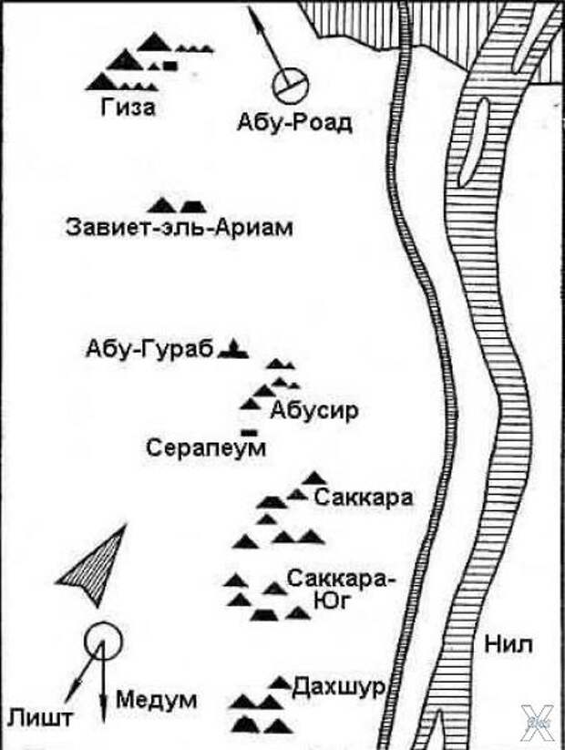 Но не только у Великих пирамид наблюдается точность закладки. Подобное обнаружено у пирамид южнее Гизы. Причем, пирамиды меньшего размера, чем Великие, обнаружены в нескольких районах к югу от Каира. Схематично ближайшие из них (к Каиру) составляют следующие области: Завиет-эль-Ариам (две недостроенные); Абусир; Саккара-север; Саккара-юг; Дахшур; Медум.