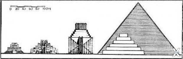 Слева-направо: зиккурат Ану в Эриду, зиккурат Иннаны в Уруку, зиккурат Этеменанки в Вавилоне (т.н. Вавилонская башня), пирамиды Джосера и Хуфу.