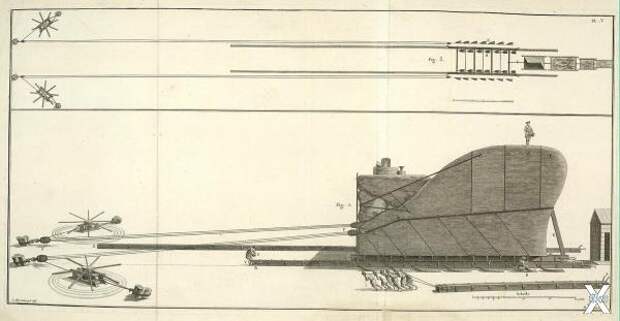 64 рабочих были распределены на 8 рычагов каждого кабестана (по 4 — на каждый рычаг). Усилие двух кабестанов — 20 480 кг. Мощность умножалась при помощи полиспастов, сложной системой подвижных и неподвижных блоков. Доведя усилие до 61440 кг. Трение снижало эффективность… но всего лишь до 50000 кг.