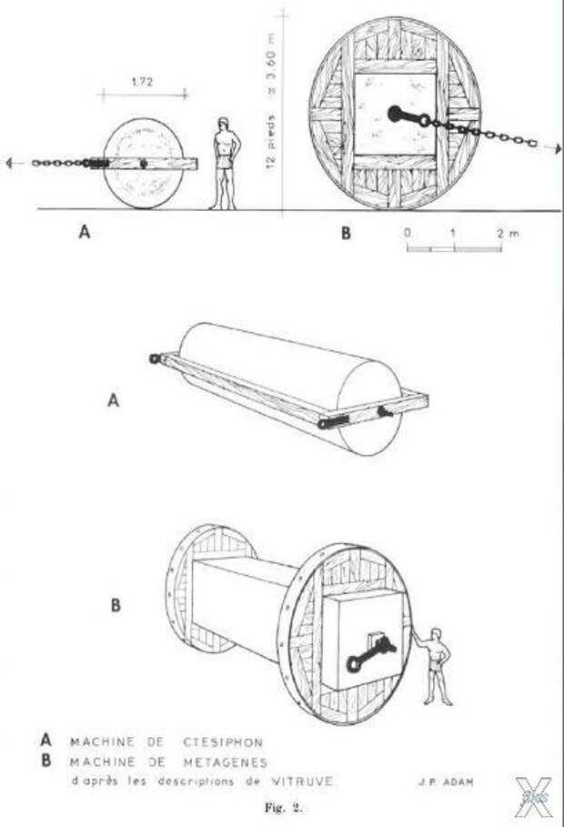«Метаген, сын Ктесифона, создал другую машину для перевозки архитрав и других предметов. Она состояла из двух колёс 12 футов (3,60 м) и он поместил архитрав между двух колёс. Он так же поставил там металлические стержни и кольца, таким образом, что, когда быки тянули машину, стержни, помещённые в железные кольца, вращали колёса. Таким образом архитравы, зажатые между колёс как оси, были перевезены на место стройки».
