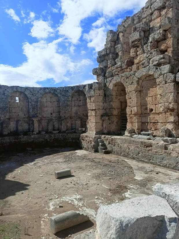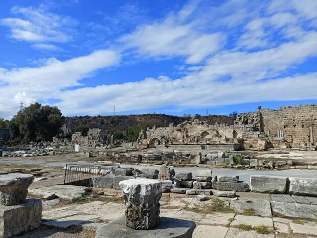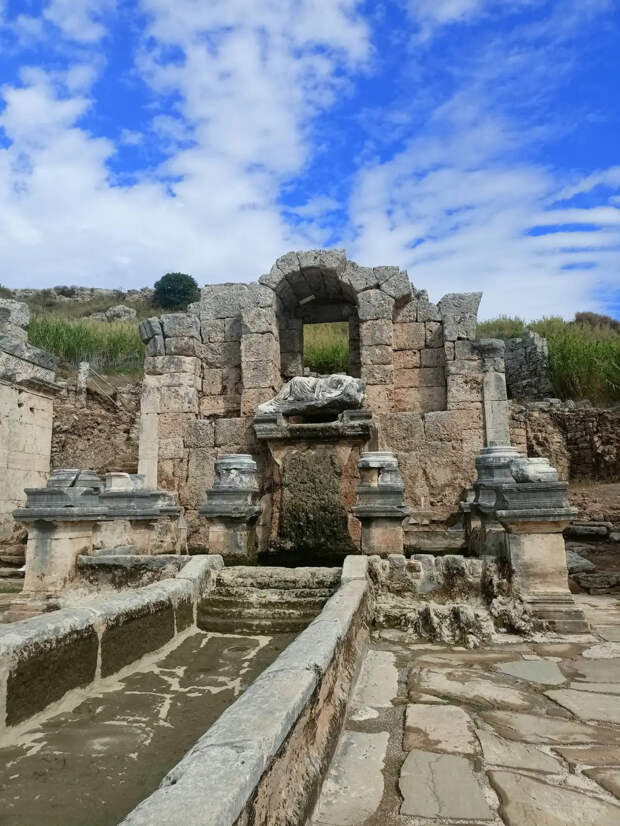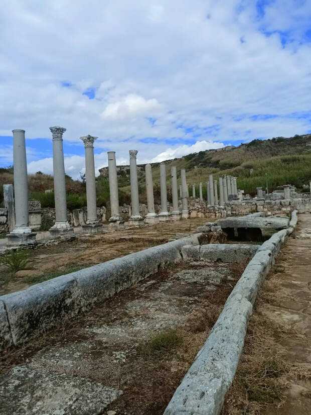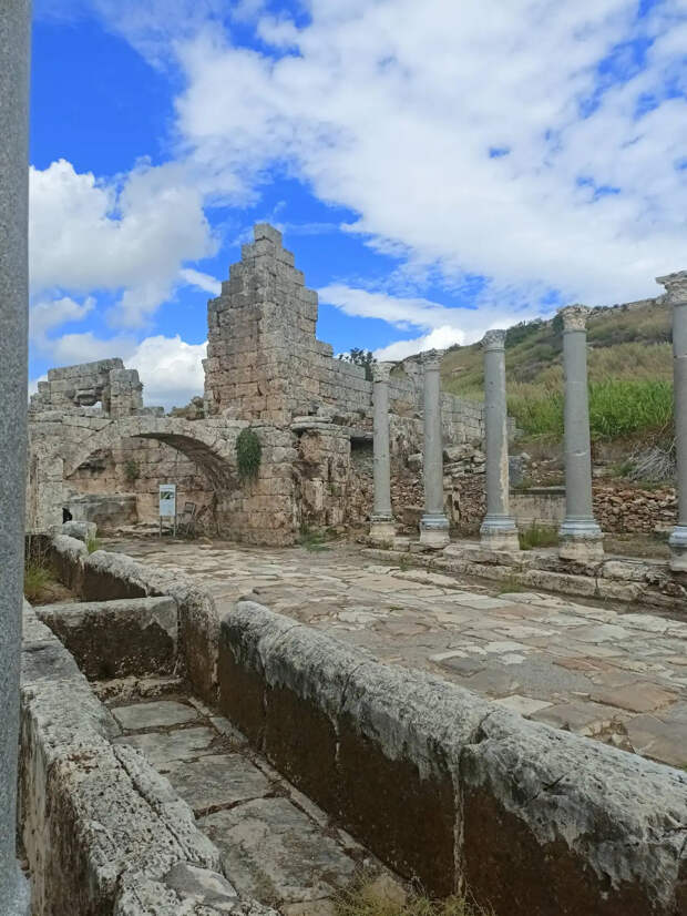 Центральная улица пересекается еще одной, поперечной, которую римляне называли декуманус. На ней также стояли колоннады, поддерживавшие портики, и шла она от западных городских ворот к восточным. И здесь же, на декуманусе, находились еще одни термы, так что проблем с омовением у жителей древнего Перге явно не существовало.