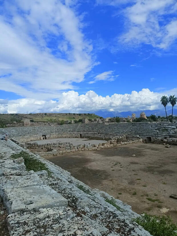 Интересного в городе много. И, прежде всего, это расположенный к югу от городских стен огромный театр на 15 000 человек, выстроенный в первой половине II в. В нем 42 ряда зрительских мест, разделенных широким проходом (диазомой) на два яруса: вверху 23 ряда и 19 рядов внизу. Сцена имеет высоту 25 метров, причем декорирована мраморными рельефами с изображением мифологических сцен. Некоторые из украшений театра находятся в Археологическом музее города Антальи. А теперь давайте представим численность жителей древнего Перге. Если считать, что в театр ходили в основном мужчины (женщины и дети имели ограниченный доступ, главным образом на праздник Великих Дионисий, причем смотреть им разрешалось лишь комедии), которые могли смотреть еще и трагедии, то это означает, что в нем обитало не меньше 15 тысяч мужчин! Мужчин-граждан, потому что «неграждане» в театр тоже не допускались. А еще в нем ведь жили женщины, дети и рабы.
