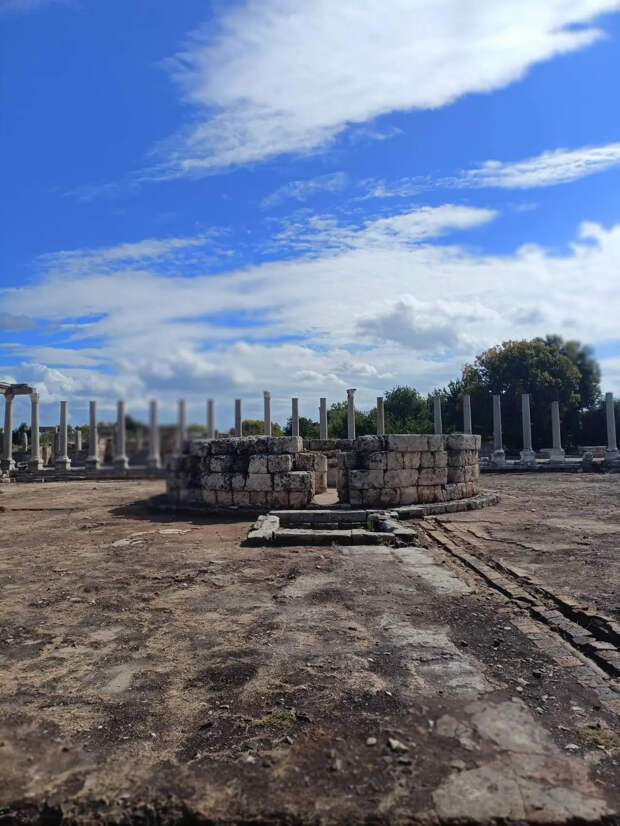 Опять-таки сразу за эллинистическими воротами находится центральная улица города около 300 м длиной. Самое интересное, что по её центральной оси шел канал с проточной водой, а проезжая часть располагалась от него по обеим сторонам. На обеих боковых, пешеходных зонах улицы были построены портики, где находились лавки торговцев и ремесленников, так что прогуливаться по этой улице было одно удовольствие. И опять-таки нам сегодня очень повезло в том, что колоннады этих портиков частично сохранились.