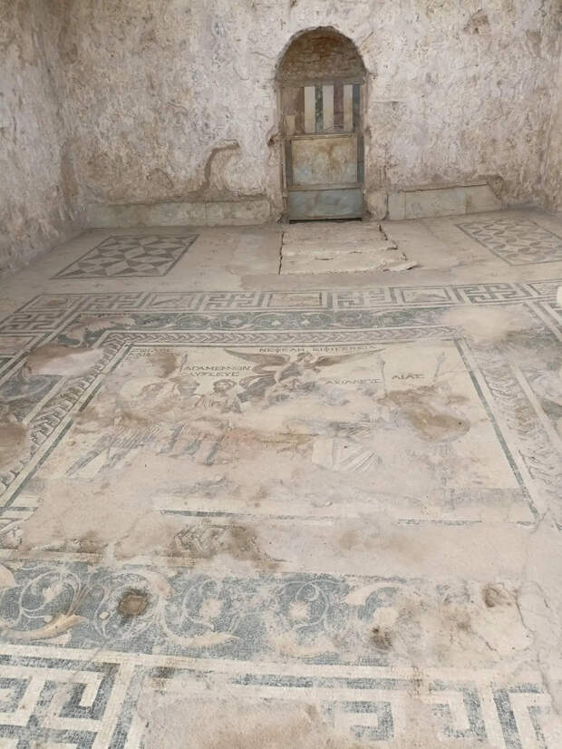 А вот это напольная мозаика с изображением героев Троянской войны, Агамемнона, Одиссея, Ахиллеса и Аякса в одном из раскопанных зданий. Понятно, что ходить по ней запрещено