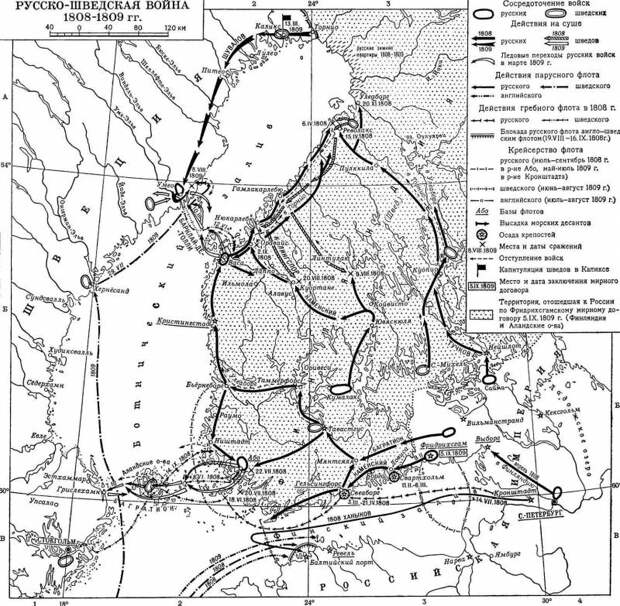 В феврале русские войска пересекли шведскую границу. Формальный же повод к войне дали сами шведы. 1 (13) февраля 1808 г. шведский монарх Густав III передал русскому послу в Стокгольме, что примирение между странами невозможно, пока русские удерживают Восточную Финляндию. Официально война была объявлена только в марте. Русские войска заняли Гельсингфорс и осадили Свеаборг – стратегическую базу шведов в Финляндии. Здесь было блокировано около трети шведский войск в Финляндии, остальные отступили на север. В это же время дивизии Багратиона и Тучкова теснили вражеские отряды на север. В марте русские войска заняли Аландские острова и остров Готланд. В апреле капитулировал Свеаборг, был захвачен огромный арсенал шведов в Финляндии, часть их флота.