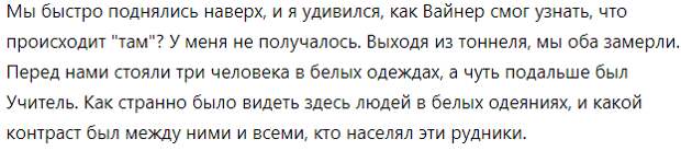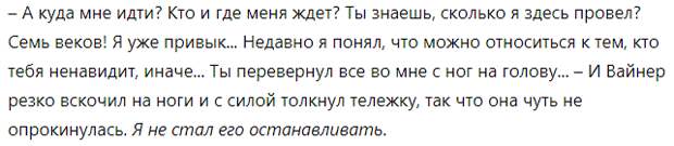 "Он помогает мне", - перебил меня Вайнер, неожиданно появившийся из ниоткуда, и добавил: "Ты можешь идти. Благодарю за помощь". - И, не прибавив ни слова, он исчез во мраке тоннеля.
