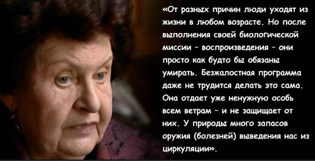 Академик Бехтерева считала, что сверхдолгожительство является сбоем в программе жизни и умирания. Поэтому ученым необходимо искать не условия, которые приводят к бессмертию, а факторы, вызывающие сбой в программе-матрице. О каких именно факторах идет речь?