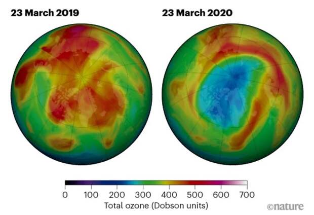 Температуры в Арктике не столь низки и стабильны, и даже зимой озона здесь обычно сохраняется достаточно. Однако в нынешнем году регион накопил огромные массы ледяного воздуха, запертого высотными вихрями полярной ячейки. По имеющимся данным, его здесь собралось больше, чем в рекордно холодную зиму 1979 года, а вместе с тем началось разрушение озонового слоя, с образованием истощенной области площадью втрое больше всей Гренландии. Во вторую половину марта стратосферные зонды отметили уменьшение содержания озона на 90 процентов на высоте 18 километров — до 0,3 частей на миллион вместо нормальных 3,5 частей.