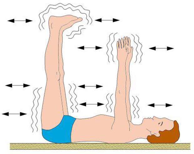 Это упражнение для капилляров улучшает кровообращение всего организма, обновляет лимфатическую жидкость и предотвращает её застой. Оно так же построено на вибрации. Даже младенцы, еще не умеющие переворачиваться самостоятельно на бочок, прекрасно выполняют это упражнение когда радуются. Они тянут свои ручки и ножки вверх, неопределенно потряхивая ими, радуясь всему, что попадает в их поле зрения, маме, папе, солнечному зайчику.(рис. 3) Взрослому человеку тоже под силу выполнить это упражнение. Необходимо лечь на спину, положить под голову твердый валик, поднять вытянутые руки и ноги вверх под прямым углом к туловищу и выполнять ими вибрирующие движения. Достаточно выполнять его всего несколько минут в день.