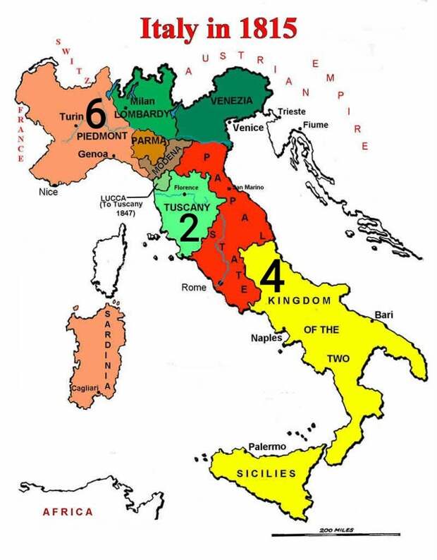 Place of birth of the 12 Presidents of the Italian Republic (1948-now) - map of Italy in 1815