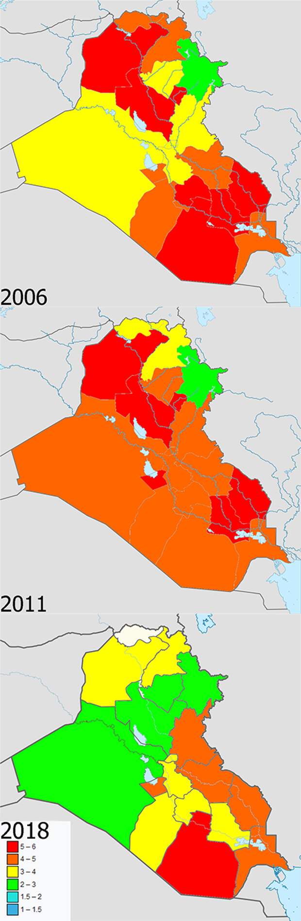 Iraq Fertility Rate by Province in 2006,2011 and 2018.