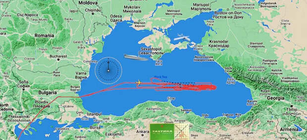 На приведенной схеме от картографической студии «Цветные карандаши «Тактика» Александра Зимовского можно оценить, как «Ястреб» RQ-4B практически беспрепятственно отработал 16 часов в зоне прямой видимости своей аппаратуры ДРЛО в южной части Черного моря на высоте около 16 000 метров.