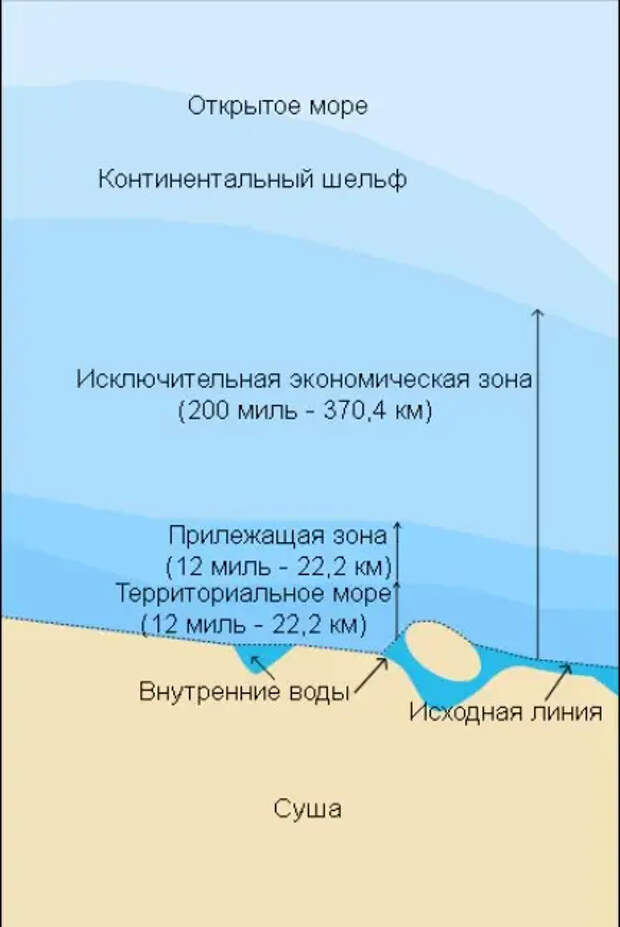 Вот схема, показывающая разделение морских территориальных зон. Воздушное пространство делится абсолютно так же, как и морское. То есть 12 миль территориальных вод – неприкосновенны, это территория государства. 12 миль прилежащей зоны, ее еще называют таможенной или санитарной – это фактически продолжение территориальных вод, в этой зоне государство имеет право осуществлять контроль за судами других стран. В общем – тоже зона контроля, и в том числе и в воздухе, если бы для этого были соответствующие средства.