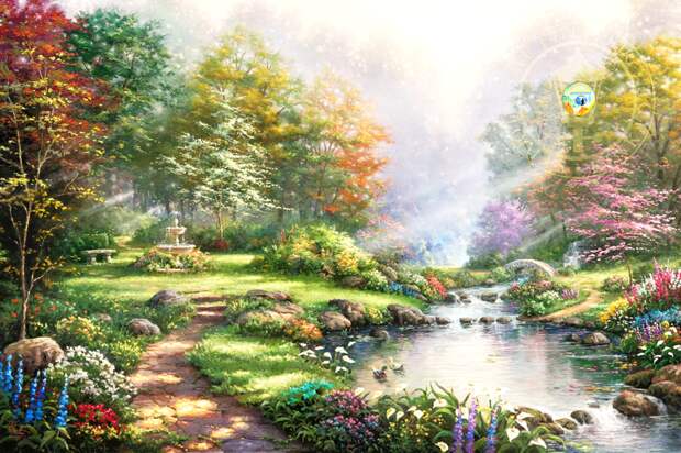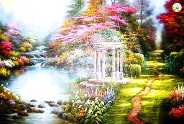 «У озера, окруженного красивыми деревьями и множеством прекрасных цветов, когда мы к нему подошли, то увидели группы счастливых людей, многие из них купались, а кто-то просто любовался цветами.