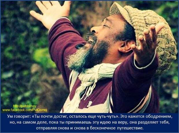 Ум говорит: «Ты почти достиг, осталось еще чуть-чуть». Это кажется ободрением, но, на самом деле, пока ты принимаешь эту идею на веру, она разделяет тебя, отправляя снова и снова в бесконечное путешествие.