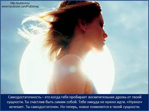 Самодостаточность – это когда тебя пробирает восхитительная дрожь от твоей сущности. Ты счастлив быть самим собой. Тебе никуда не нужно идти. «Нужно» исчезает. Ты самодостаточен. Но теперь, новое появляется в твоей сущности.