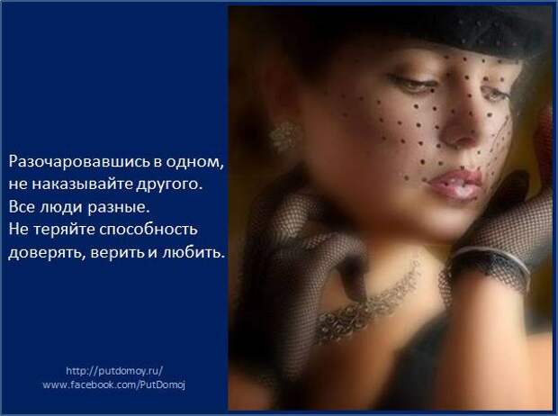 Разочаровавшись в одном, не наказывайте другого. Все люди разные. Не теряйте способность доверять, верить и любить.