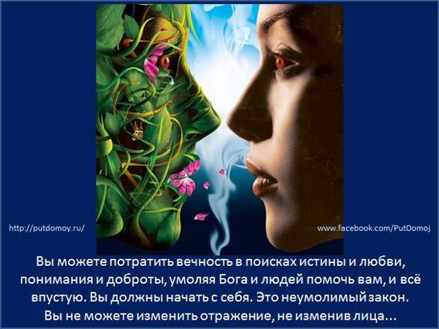 Вы можете потратить вечность в поисках истины и любви, понимания и доброты, умоляя Бога и людей помочь вам, и всё впустую. Вы должны начать с себя. Это неумолимый закон. Вы не можете изменить отражение, не изменив лица. Сначала поймите, что ваш мир — лишь отражение вас самих, и перестаньте искать недостатки в отражении. (Нисаргадатта Махарадж)