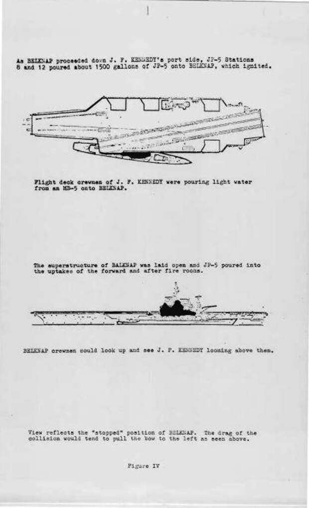 Острые края металлоконструкции “Белкнапа” впились в нависающий сверху авианосец, разрушив помещения ниже угловой палубы, откуда хлынули потоки авиационного керосина JP-5. Две из трёх находившихся в том месте заправочных станций находились под давлением с расчетной скоростью подачи топлива 4000 литров в минуту.