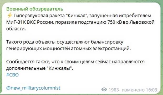 Телеграм-канал "Военный обозреватель" уточняет, что поражена расположенная здесь подстанция 750 кВ. С ее помощью осуществляется балансировка генерирующих мощностей атомных электростанций. Также сообщается об ударе еще одним" Кинжалом", но пока нет данных, куда он прилетел.