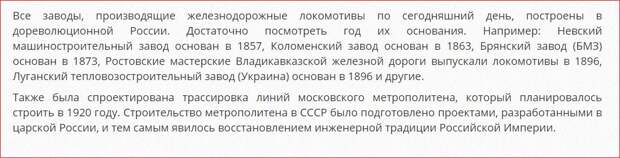 Учился с 1968-1978 год и нам вбивали в головы -Империя была гнилая, соха, да кирка, тяпка и коса.Люди прибитые помещиками и только революционеры всем блага желали сами не работая, убивали всех царей, чиновников-были героями и подняли таки восстания освободив народ от тупости непроходимой-ибо были забитыми придурками-ну конечно кроме рэволюционеров.Потом прогресс-настроили всем по вилле, свобода всех и в космос..Что до сих пор мелется даже адекватными блогерами..