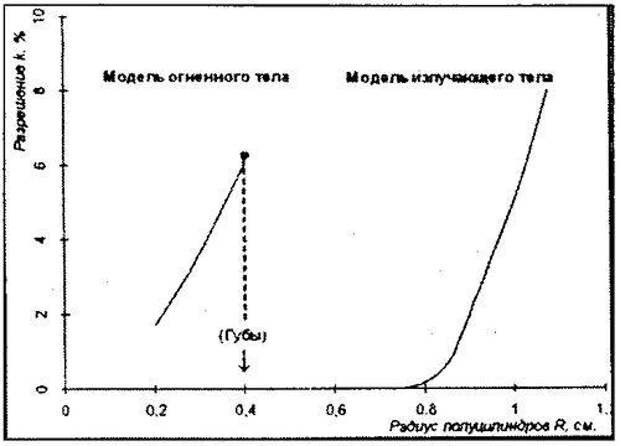 На этом графике видно, что отпечаток частей тела с четкостью разрешения, подобной существующей на плащанице, образуется только при моделировании процессов "огненного тела" (кривая слева)