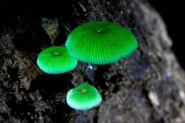 Эти маленькие белесые светящиеся грибы обычно растут на лесном валежнике, особенно там, где земля сырая и влажная — например, в тропиках. В зависимости от вида они могут светиться разными оттенками синего, зеленого, желтого.