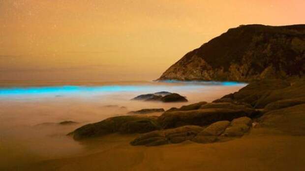 Еще один феномен, вызванный биолюминесценцией, — фитопланктон, который освещает прибрежные воды и придает волнам космическое неоновое сияние.