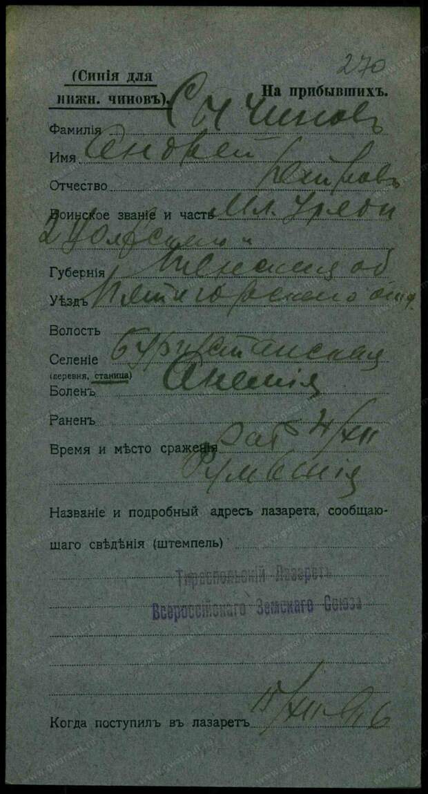Мл. урядник 2-й Волгский полк Терского казачьего войска Терская обл. Пятигорский отдел Ранен 4 декабря 1916 г. в Румынии. Поступил 15 декабря 1916 г. в Тираспольский Лазарет Всероссийского Земского Союза