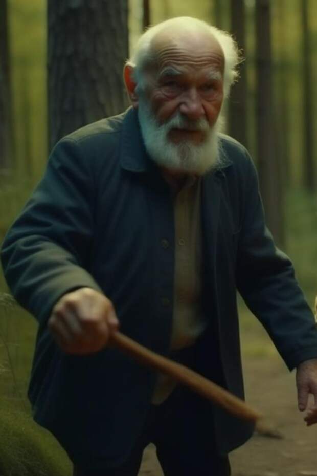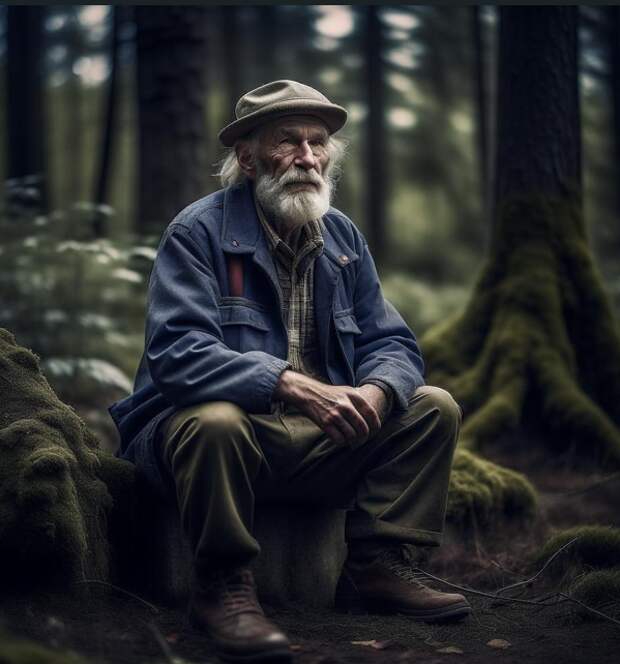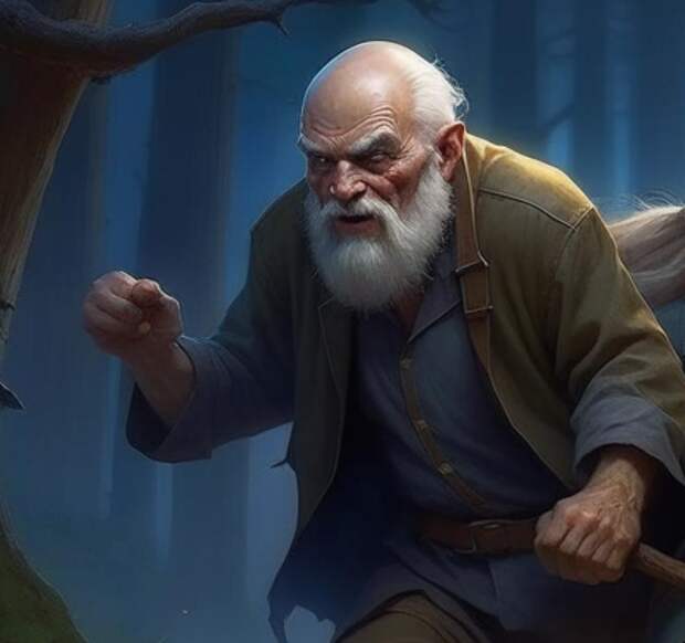 Старик был низкорослым, одетым небрежно. Его старомодный камзол неопределённого цвета был помят и покрыт пятнами. Обветшалые штаны были заправлены в блестящие сапоги, словно только что отполированные. У него были светлые волосы с проседью, спутанные и грязные. В них я заметил труху и еловые иголки.