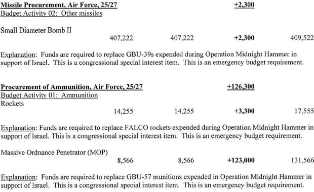 - 123 миллиона долларов будут направлены на замену барражирующих боеприпасов, ракет с лазерным наведением и планирующих авиабомб, которые использовались в ходе операции по нанесению ударов по иранским ядерным объектам, соответственно.