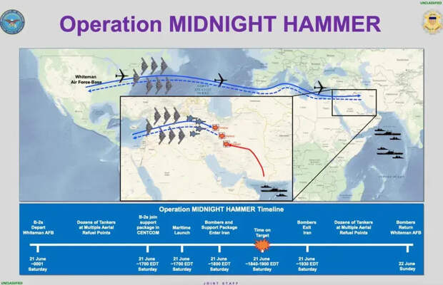 Пентагон ранее заявлял, что в операции «Полуночный молот» приняли участие 125 самолётов, в том числе B-2. Президент Дональд Трамп также заявил, что в состав сил входили малозаметные F-22 и F-35, а также десятки самолётов-заправщиков. По словам официальных лиц США, B-2 сбросили в общей сложности 12 боеприпасов на глубоко заглубленный ядерный объект Ирана в Фордо и еще два на подземный объект в Натанзе. Иранский ядерный объект в Исфахане также подвергся обстрелу более чем двумя десятками крылатых ракет наземного базирования «Томагавк», выпущенных с подводной лодки USS Georgia.