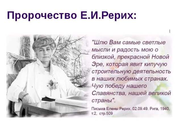 Елена Ивановна Рерих была выдающейся женщиной, философом и общественным деятелем. Она специализировалась на оккультизме и ясновидении. Она сделала множество пророчеств и предсказаний о будущем человечества. Многие из ее пророчеств сбылись.