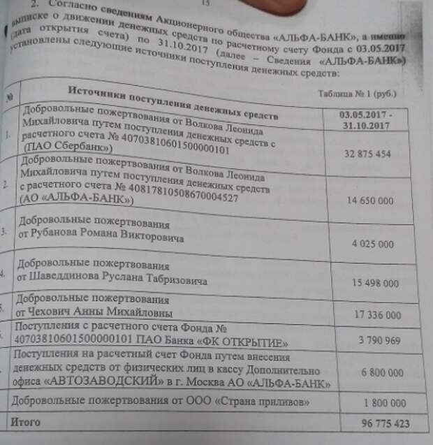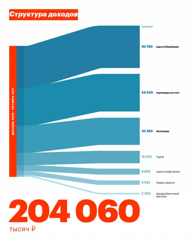 Во-первых, всех сразу же заинтересовали более серьезные суммы пожертвований за несколько месяцев 2017 г. Согласно данным, опубликованным самим Волковым, сумма пожертвований, поступивших на его имя, составила более 204 млн. рублей: