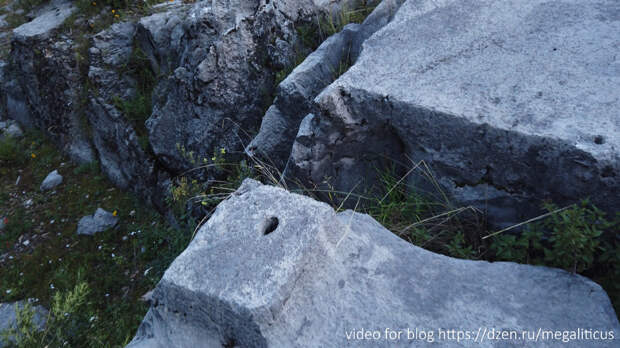 Причём, скальное основание обработано полностью. Вероятно, блоки извлекались при помощи нетривиальной технологии. Это видно по следам оставленным по периметру и в трещинах скального основания.