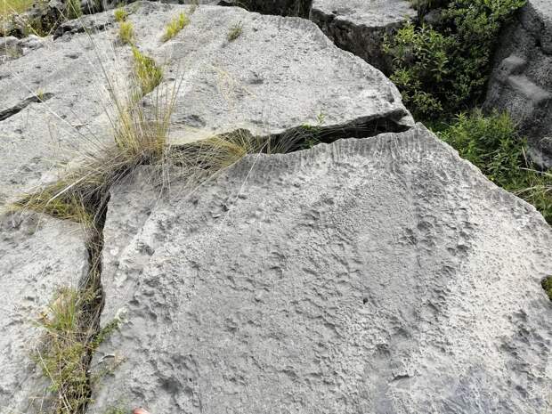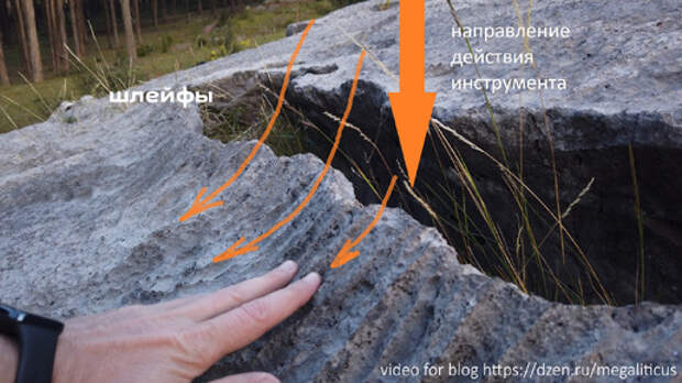 Ещё, как вариант, некоторые следы могли образоваться при помощи гидроабразивного воздействия. Однако, вытянутые кромки заставляют задуматься об ином способе добычи камня в этом необычном карьере.
