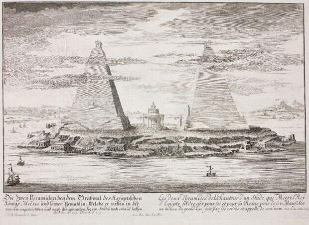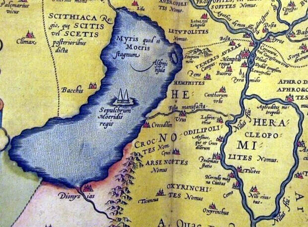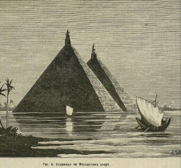 Геродот так описывает это легендарное место: "...удивление вызывает так называемое Меридово озеро... Окружность этого Меридова озера составляет 3600 стадий, или 60 схенов, т. е. как раз равняется длине всей прибрежной полосы Египта. В длину озеро простирается с севера на юг, и в самом глубоком месте глубина его 50 оргий. А то, что оно – произведение рук человеческих и вырыто искусственно, это ясно видно. Почти что посредине озера стоят две пирамиды, возвышающиеся на 50 оргий над водой; такой же глубины и их подводная часть. Рядом с каждой пирамидой поставлена колоссальная каменная статуя, восседающая на троне. Таким образом, высота этих пирамид 100 оргий, а 100 оргий равняется как раз 1 стадии и 6 плефрам, так как оргия имеет 6 футов, или 4 локтя; фут же равен 4 пяденям, а локоть – 6 пяденей. Вода же в озере не ключевая (местность эта совершенно безводна), а проведена по каналу из Нила, и шесть месяцев она течет в озеро, шесть месяцев – обратно в Нил. Во время отлива воды рыбная ловля в озере доставляет доход царской казне каждый день по 1 таланту серебра, а за время прилива – только 20 мин."