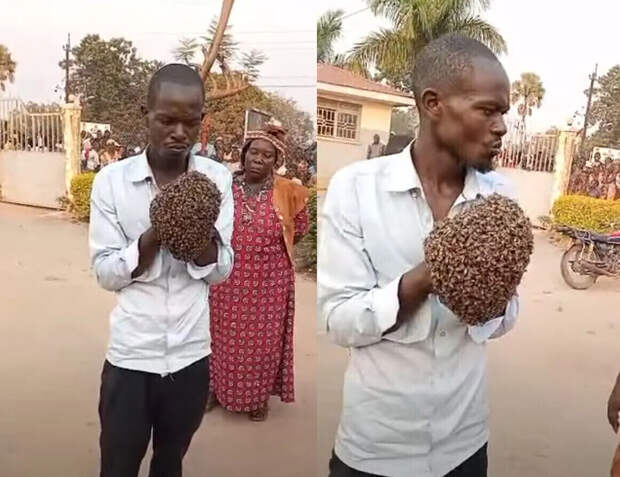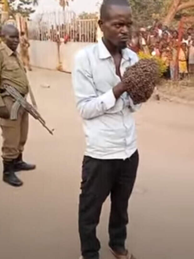 На видео из Уганды потенциальный угонщик мотоциклов "закован своеобразными наручниками" из пчелиного роя, который вызвала местная колдунья.