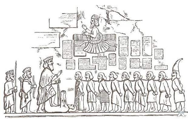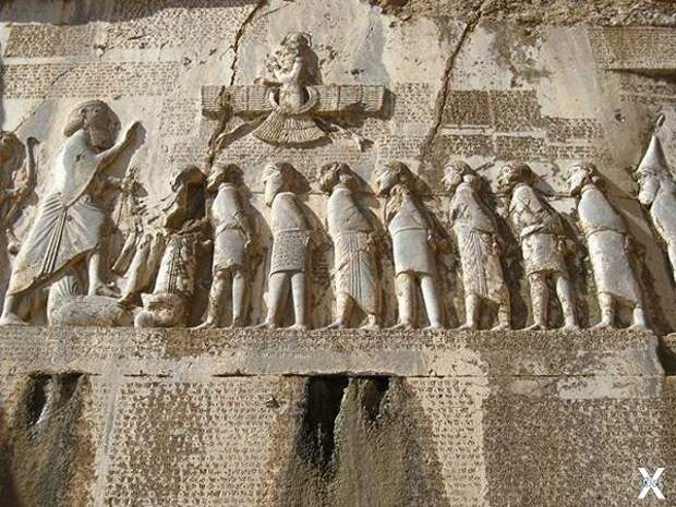 Но ни человеческий вандализм, ни безжалостное время не смогли уничтожить бесценный памятник истории. До сих пор под косыми лучами солнца на скальной плоскости четко прослеживаются клинописные строчки. Надпись, расположенная на высоте 105 м, высечена на трех языках - древнеперсидском, эламском и аккадском - и рассказывает о событиях, относящихся к концу правления царя Камбиза (ум. в 522 г. до н.э.) и первым годам царствования Дария I (522-486 гг. до н.э.). Над текстами помещен рельеф: бог Ахура-Мазда, протягивая левую руку к Дарию, символически вручает ему царскую власть, а поднятой правой рукой благословляет царя. Дарий изображен в натуральную величину в царской короне. Правая рука его в молитвенном жесте простерта к Ахура-Мазде, левой он опирается на лук. Левой ногой Дарий попирает поверженного мага Гаумату, захватившего престол еще при жизни Камбиза. За Гауматой изображены еще восемь мятежников, поднявших восстание при восшествии Дария на трон, и непокорный вождь сакского племени тиграхауда. Руки пленников связаны за спиной, они скованы одной длинной цепью. За спиной Дария - двое его воинов, копьеносец Гобрий и лучник Аспатин. По сторонам рельефа тянутся колонки текста. Общая высота надписи вместе с рельефом составляет 7,8 м, ширина - 22 м.