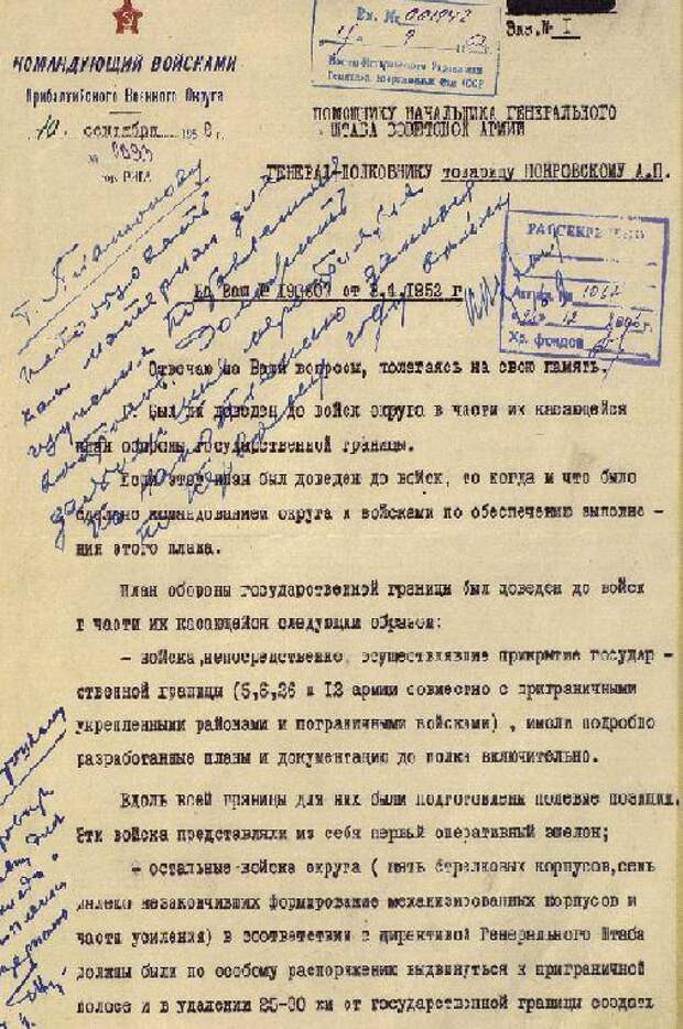 Из ответов военноначальников генерал-полковнику А.П. Покровскому.И.Х. Баграмян: «…Войска прикрытия (1-й оперативный эшелон) дислоцировались непосредственно у границы и начали развертывание под прикрытием УРов с началом боевых действий. Заблаговременный их выход на подготовленные позиции ГШ был запрещен, чтобы не дать повода для провоцирования войны со стороны фашисткой Германии… МК в пунктах постоянной дислокации были подняты по боевой тревоге и начали выдвижение в районы сосредоточения с началом боевых действий…»