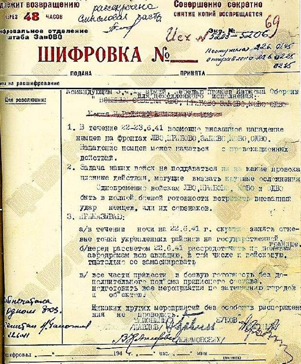 В пункте 1 ШТ зачеркнуто «в ночь» - правящие текст товарищи, вероятно, посчитали что нападение произойдет не в ночь на 22-го июня. Также они должны были понимать, что до рассвета ШТ уже могла не дойти до войск. Это показывает, что высшее руководство КА проигнорировало прямое указание И. Сталина. Если бы руководство КА хотело предупредить войска о нападении именно в ночь с 21 на 22 июня, то они обязаны были сообщить основные положения Директивы в ВО по телефону. Однако высшее руководство КА звонило в округа по другому поводу…
