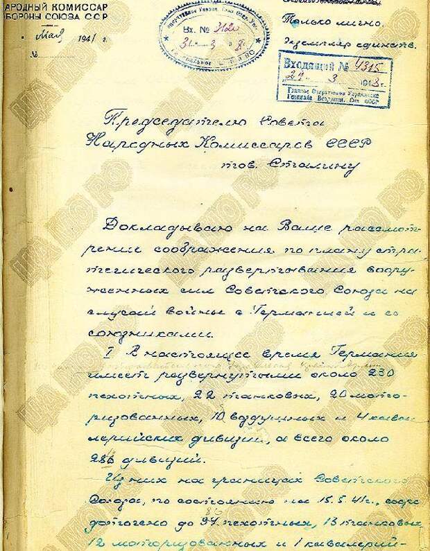 16.04.41 – Нарком и начальник ГШ представили И. Сталину «Записку…», в которой изложили свое видение «Планов…», построенных на упреждающей атаке германских ВС до окончания их сосредоточения против СССР.