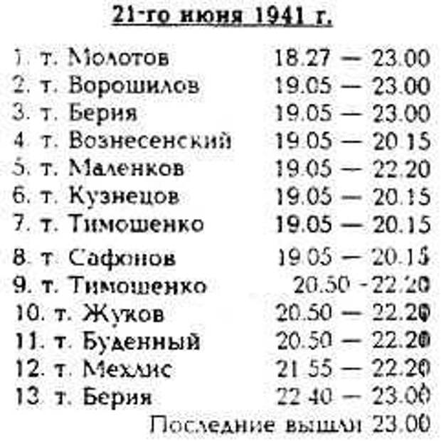 Возможно, И. Сталин чувствует, что руководство КА делает что-то не то… На совещание в 20-50 приглашаются С. Тимошенко, Г. Жуков и С. Буденный. Присутствуют соратники Сталина: Молотов, Ворошилов, Маленков (Буденный в их числе). Ватутин, отмеченный в мемуарах, отсутствует.