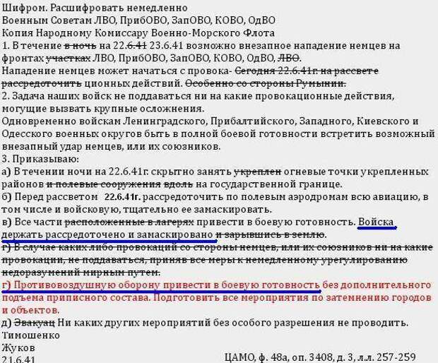 В Директиве синим цветом подчеркнут текст, который отсутствует в ШТ, принятой ЗапОВО. В то же время он присутствует в черновике ШТ. Это свидетельствует о том, что в текст ШТ правки вносились вторично. И это должен был сделать человек, которому текст Директивы не нравился – это мог быть и Буденный после получения копии. Он мог внести изменения с согласия подписавших (или же они все находились в приемной ШО). Правка касается удаления текста «войска держать рассредоточено и замаскировано» и «противовоздушную оборону привести в боевую готовность». Указанные мероприятия и так проводятся при приведении войск ВО в боевую готовность (выйти в запасной район, замаскироваться и развернуть средства ПВО; поднять по боевой тревоге все части, включая части ПВО, как окружного подчинения, так и входящих в состав дивизий, корпусов и т.д.). Конечно, на сайтах имеется версия, что шифровальщики были усталые и пропустили текст. Так не бывает...