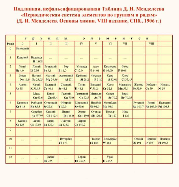 Взглянем на таблицу Менделеева, но не современную кастрированную, а ту самую от начала 20 века (говорят, она приснилась ему в состоянии похмелья, наш человек был).