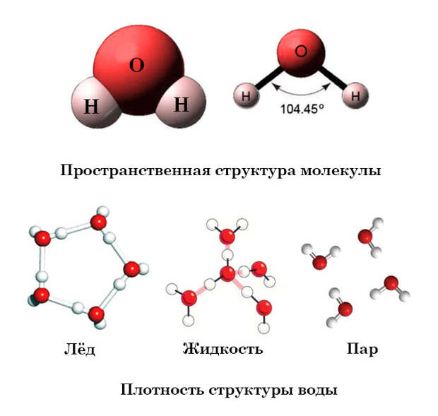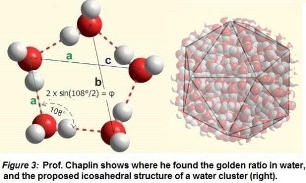 Возможно уникальные свойства воды связаны с её структурой. У воды в зависимости от её агрегатного состояния (пар, лёд, вещество) меняется угол ковалентных связей. Интересно, что у талой воды этот угол может составлять 108° и при этом образовываются правильные пятиугольники, - соблюдается золотая пропорция.