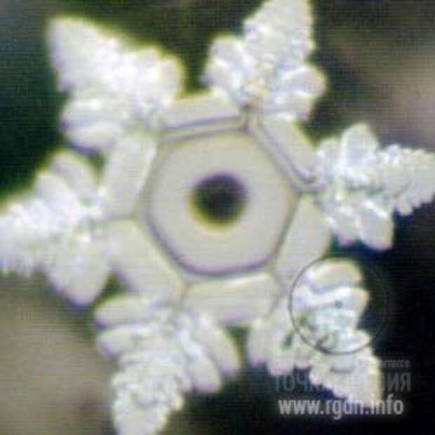 На этой фотографии также снят кристалл льда, получившийся из воды, взятой из того же водоёма после молитвы. Масару Эмото никогда прежде не встречал подобной формы кристалла ни в одном из своих более 10 000 экспериментов с пробами воды. Как вы видите, это гептагон, или 7-гранный кристалл. Рассказывает Ребекка из Долфин Суим (DolphinSwim): «Преподобный Като объяснил, что в своей одночасовой молитве он вызывал духов семи Богинь Удачи.» (На фотографии цвет золотой, а не белый)