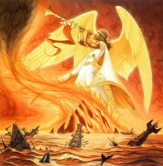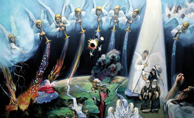 В Библии эта последовательность отображена очень четко трубным гласом Ангелов: «Первый Ангел вострубил – и сделались град и огонь…», «Второй Ангел вострубил – и третья часть моря сделалась кровью…», «Третий Ангел вострубил – и многие из людей умерли от вод…», и так далее семь Ангелов.